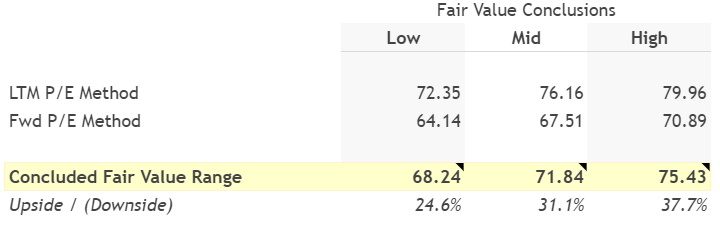 MasterCard is the best comparable for Visa and has similar projected growth and margin performance. I selected a Fwd P/E multiple range of 25.5x to 29.5x, in line with MasterCard and Global Payments on the low-end and above all it's peers on the high-end. My selection implied a Fair Value per Share range of $71.95 to $83.24, with a mid-point of $77.60.